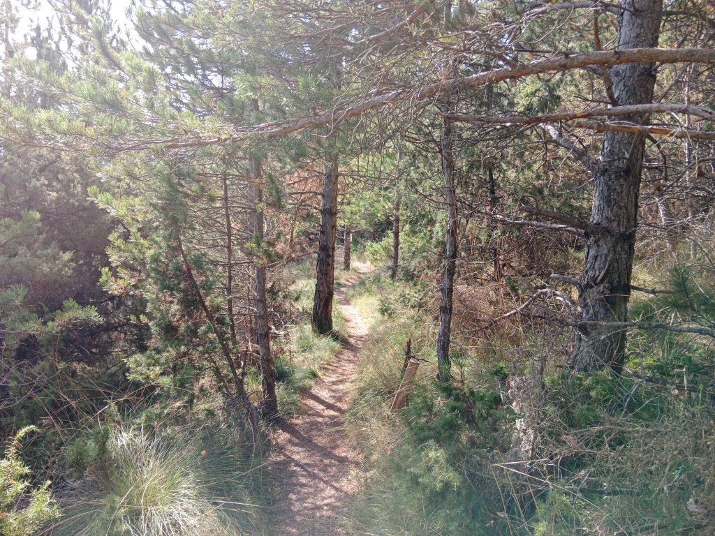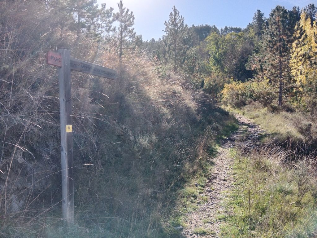 A los pocos metros de la pista, encontrarás una senda que se adentra en el monte. Está hacia la derecha y está marcada con una señal donde pone «RC-1 Cañonera-Axarimendia».